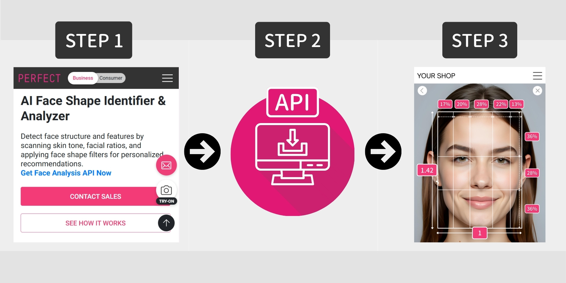 Embed the API in web or mobile flows: authenticate, upload an image, receive landmarks and ratios, then render AR try-ons and personalized product suggestions. Perfect provides solution support and best-practice UX patterns.