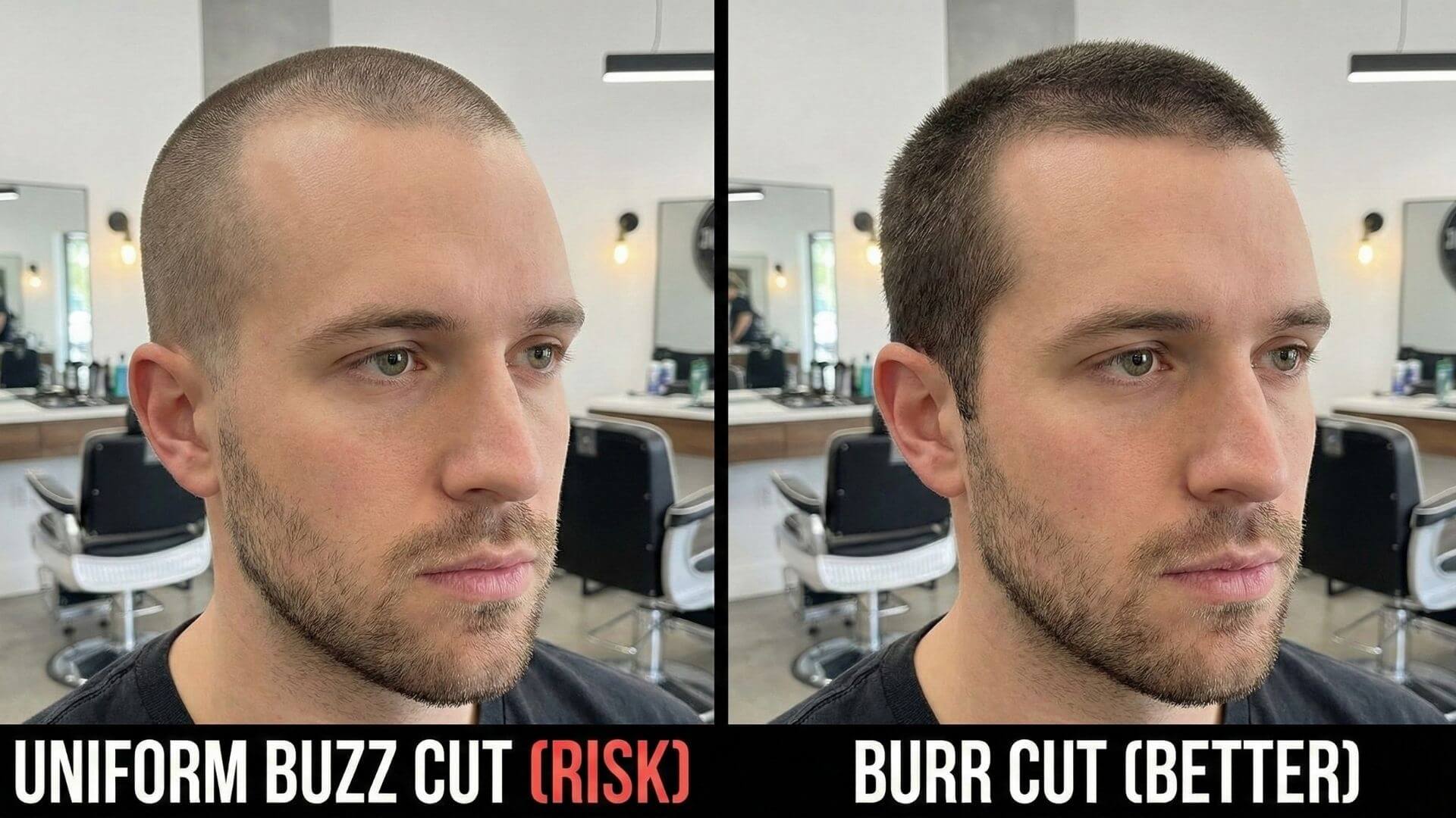 The Risk: A uniform buzz cut (same length all over) has no ability to balance your features. It exposes the full length of the skull and the height of the forehead.