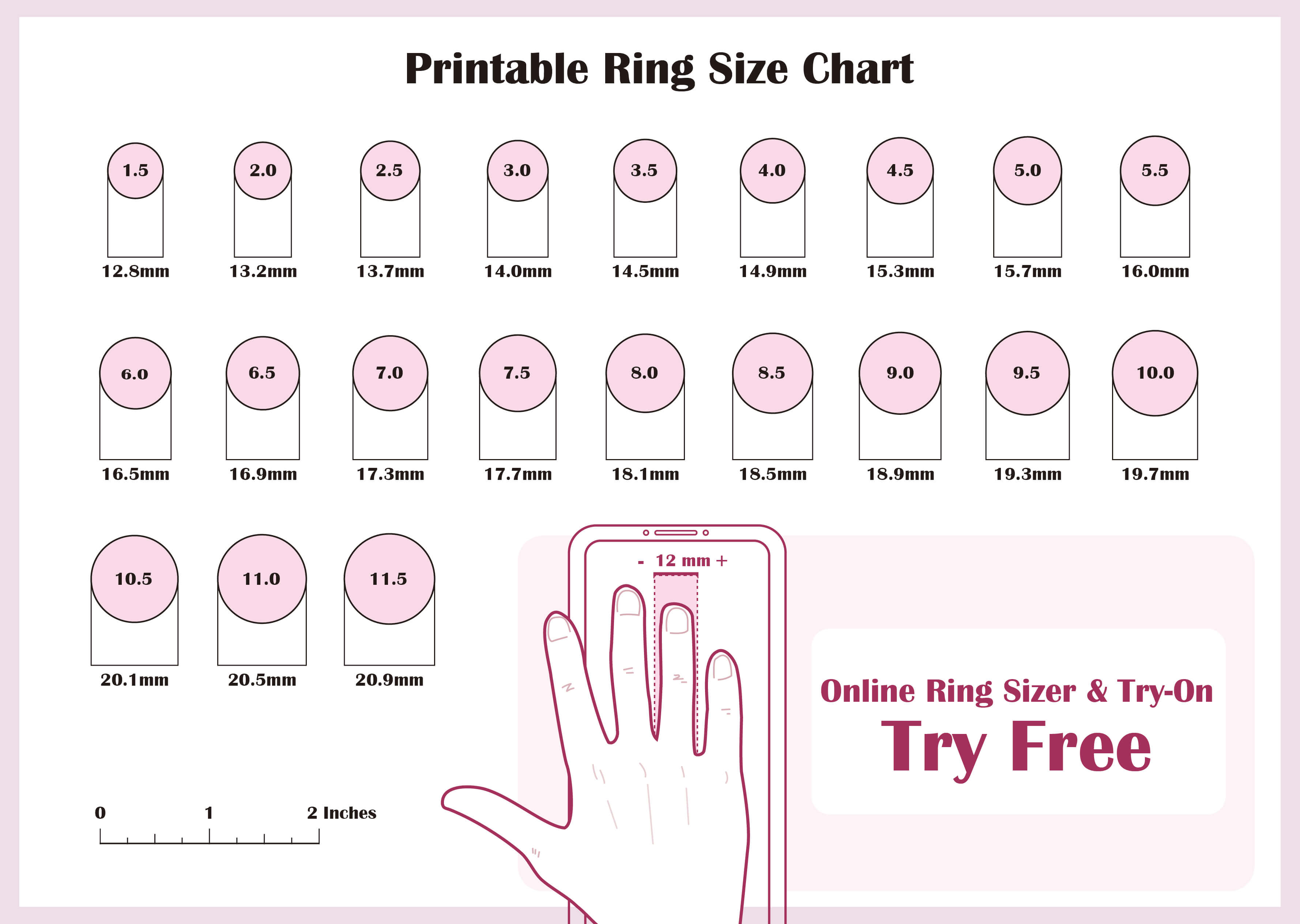 Enable camera to virtually try on rings or measure & calculate ring size with AI. Click ‘Size Guide’ or scroll down for printable ring size chart. Contact Sales >