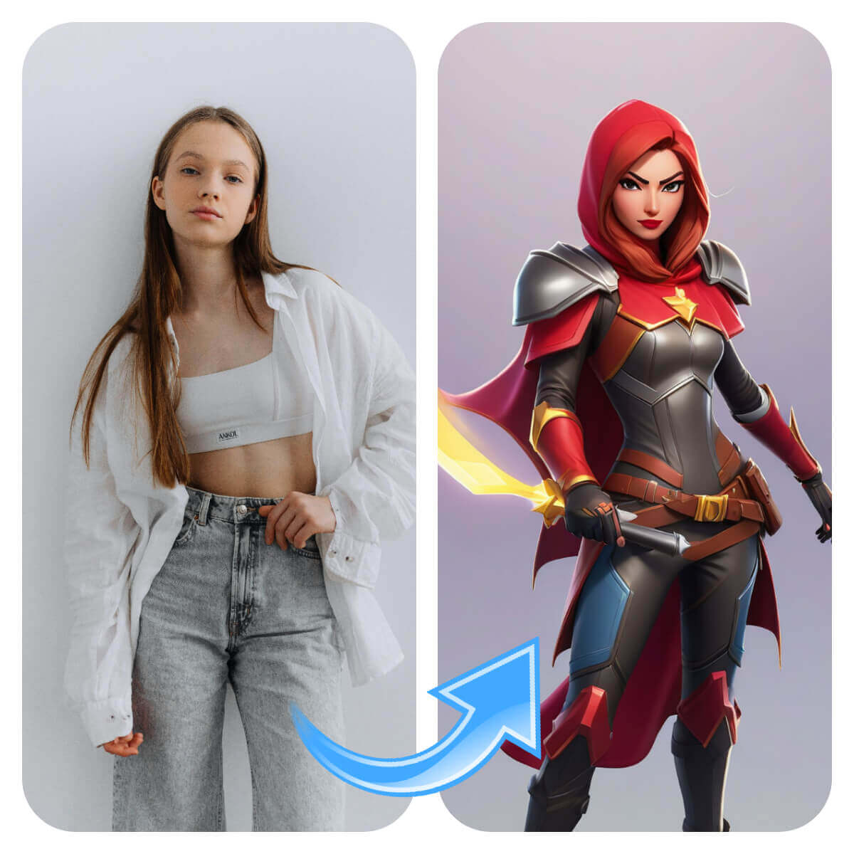 - In the prompt section, type in "Transform the woman in a red armor with bright red cape, long straight light brown hair, Fortnite game style, same face & pose as the photo, concept art, inspired by Luma Rouge, crimson peek, x-force outfit."