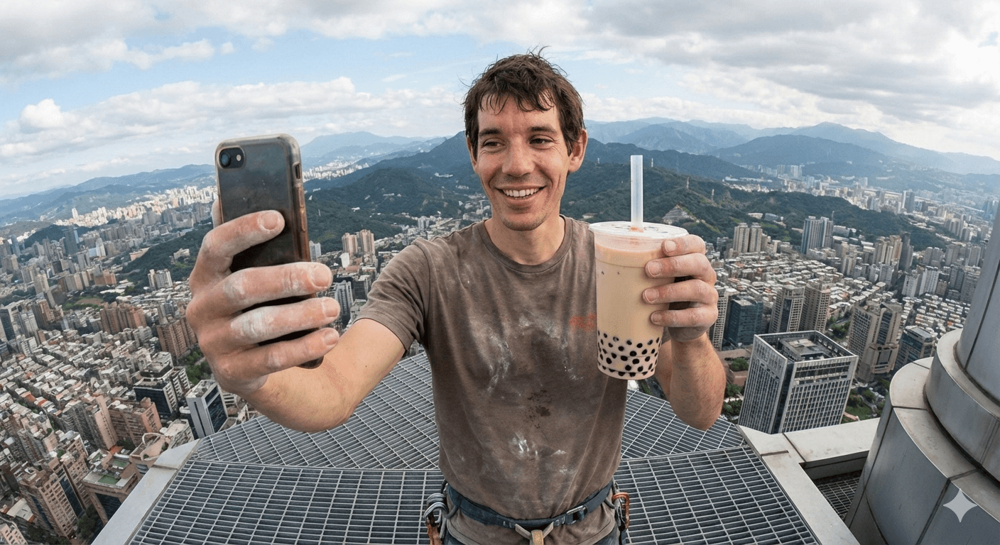 The Alex Honnold meme went viral following his January 25, 2026, Netflix special "Skyscraper Live," where he free soloed Taiwan's Taipei 101. The meme features Honnold (or AI versions of him) scaling impossible urban structures with his signature calm demeanor. You can recreate this look using YouCam AI Pro by prompting the AI with specific details like his iconic red T-shirt and the building's bamboo-tiered architecture.