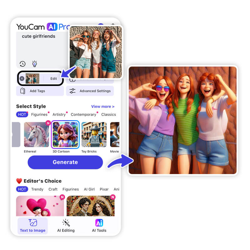 Want to create your own unique Galentine’s Day memes? With YouCam AI Pro, you can turn any image into a funny and stylish Galentine’s Day meme using the Image to Image feature. Here’s how:
