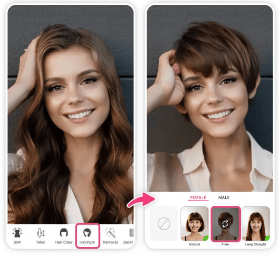 The app offers a hairstyle feature with 12+ female and 9+ male hairstyle options, including bangs styles, options for more volume, long hairstyles and even a hairstyle transfer option.
