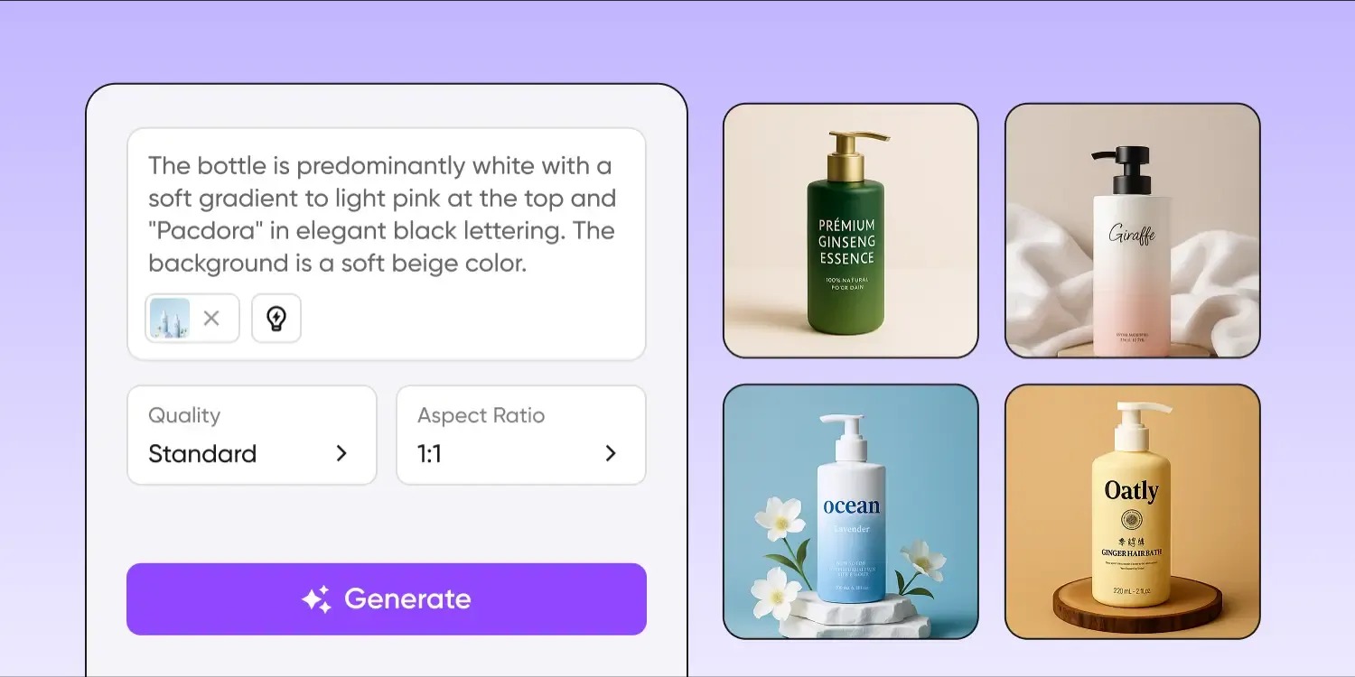 This tool lets you instantly create contextual, branded, or lifestyle backgrounds using only text prompts. From minimalist studio shots to vibrant, themed scenes, you can match your packaging design with the perfect setting in seconds.