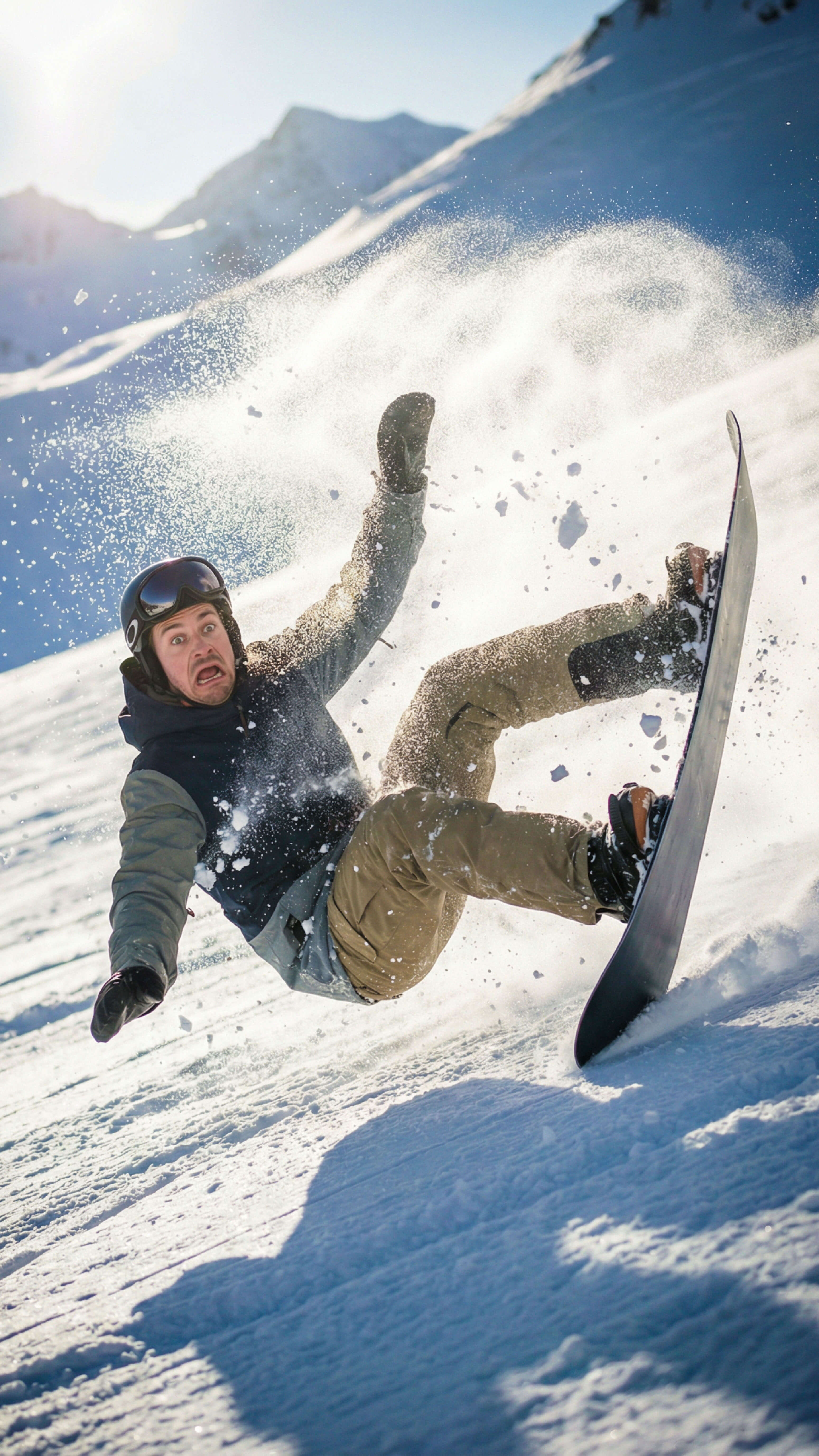- “A snowboarder wiping out in slow motion, exaggerated facial expression, meme-style illustration”